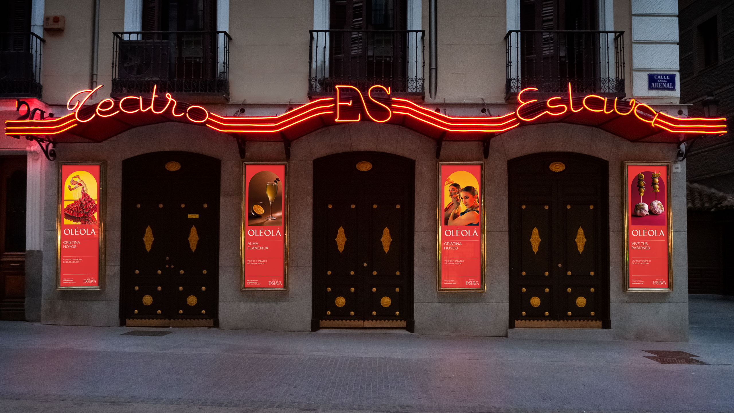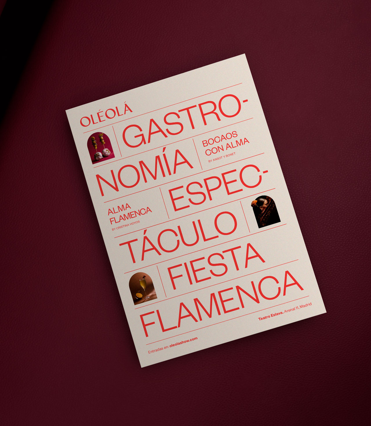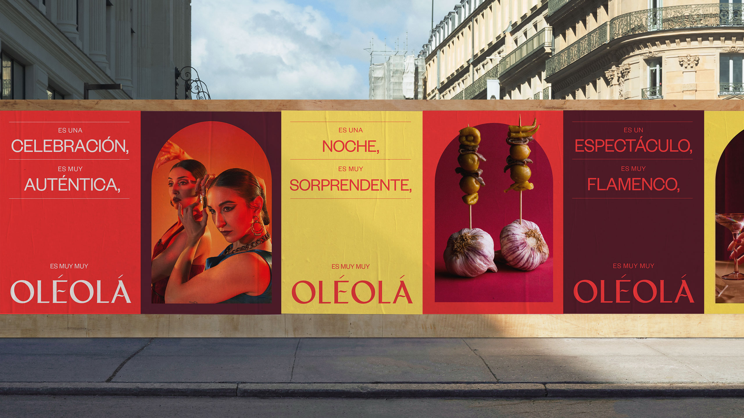 El wordmark de OléOlá se apoya en la virgulilla de la eñe para generar reconocimiento, al mismo tiempo que sugiere el ondeo de los trajes flamencos. La gama cromática conecta con nuestro carácter vitalista y alegre. La fotografía de producto, desarrollada por Anson & Bonet, eleva a categoría de arte nuestra gastronomía, y el sistema visual parte de un elemento tan nuestro como el arco, presente en monumentos, plazas, soportales o en el propio teatro, para cohesionar la comunicación y abrir una ventana desde la que observar todo lo que sucede en el tablao.