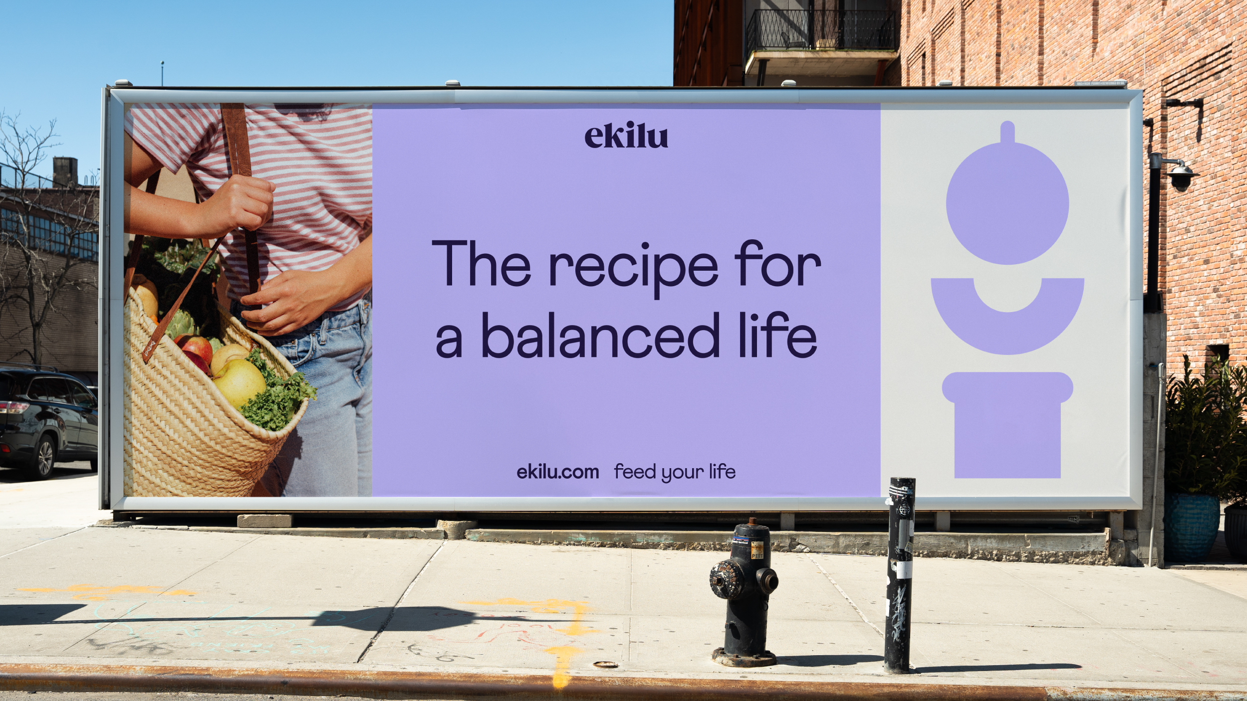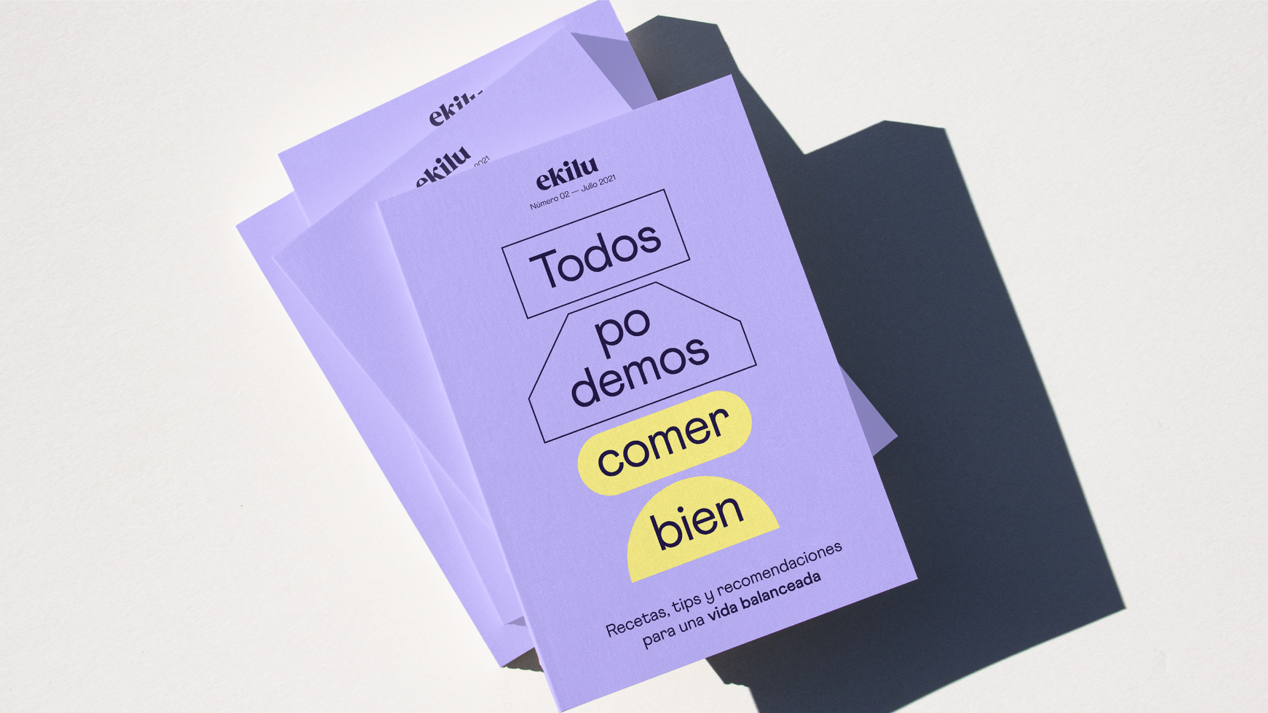 Tomando el concepto de equilibrio como eje vertebrador, realizamos una traducción al lenguaje visual para conectar todos los assets de la marca. Así, definimos una gama cromática formada principalmente por dos tonos complementarios; justificamos al centro los textos y demás elementos que acompañan cada comunicación; y diseñamos estructuras geométricas que expresan metafóricamente la promesa de ekilu: Ayudar a llevar una vida balanceada de forma sencilla y sin culpas.