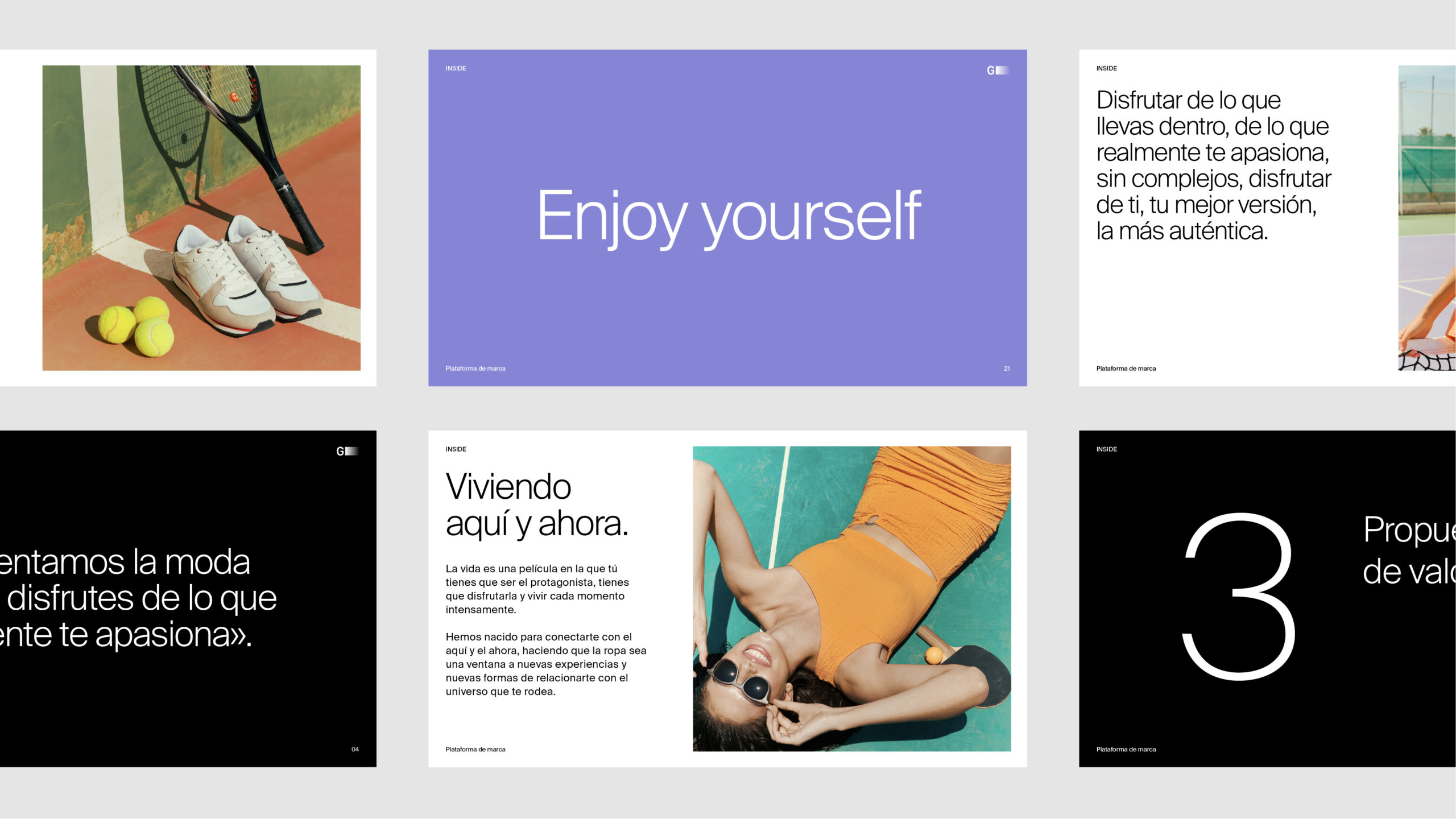 Plasmamos este posicionamiento en una personalidad vital, vibrante y apasionada; y la articulamos con un nuevo Tono de Voz que permitiese a Inside interactuar y relacionarse con sus públicos de forma única y diferencial a través de cualquier punto de contacto, físico o digital.