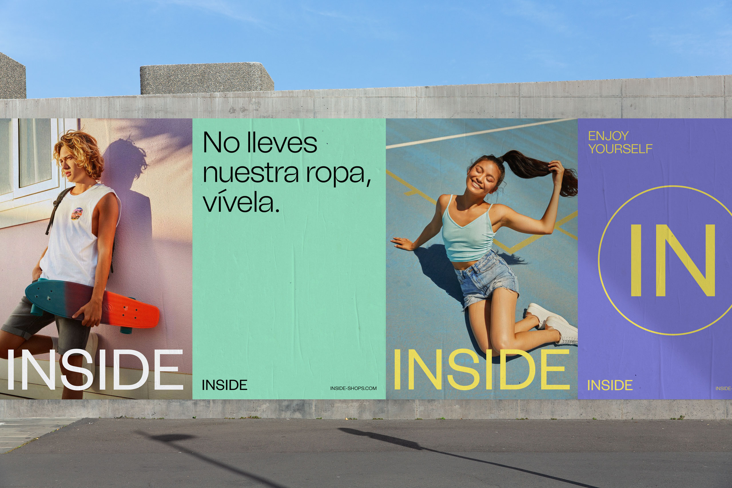 Para desarrollar la identidad visual partimos de una premisa clara: la necesidad de ceder protagonismo a las audiencias de la marca. Con esta reflexión como punto de partida decidimos evolucionar el logotipo, llevándolo hacia unos códigos más neutrales y versátiles que le permitieran vascular y adaptarse a todas las historias que a partir de ahora Inside va a vestir. Además, acompañamos este nuevo logotipo de una paleta cromática vital capaz de transmitir y proyectar la nueva personalidad definida.