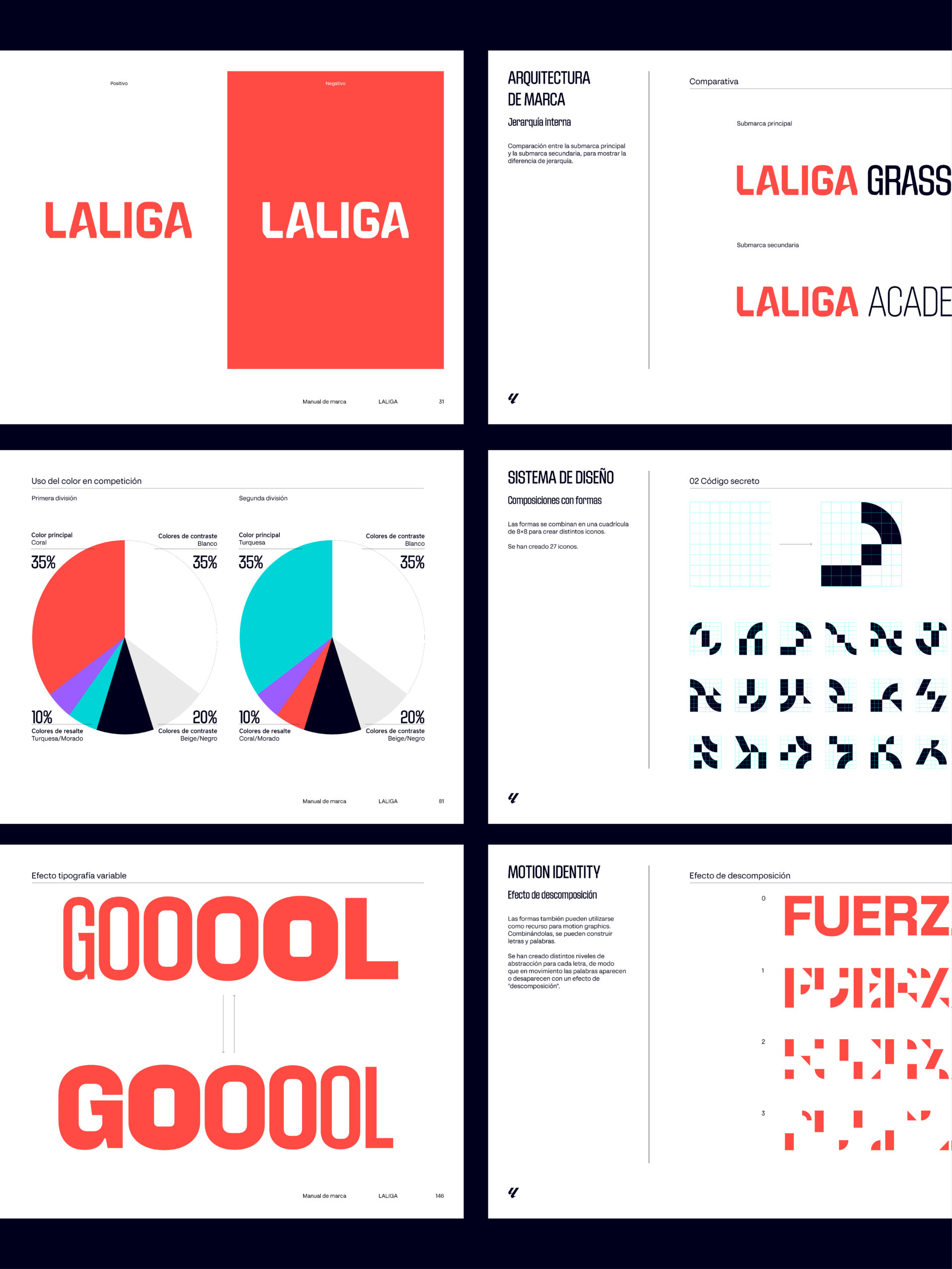 Definimos y desarrollamos una nueva tipografía LALIGA que nos ayudara a darle voz a ese sentimiento de grandeza y a esa ambición de pluralidad. Un desarrollo tipográfico que cuenta con tres variantes que nos permiten adaptarnos a los nuevos contextos, hacer brillar nuestra identidad, conectarla con nuestra Marca y ofrecer una nueva forma de uso más dinámica y digital que da fuerza y vida en los distintos contextos.